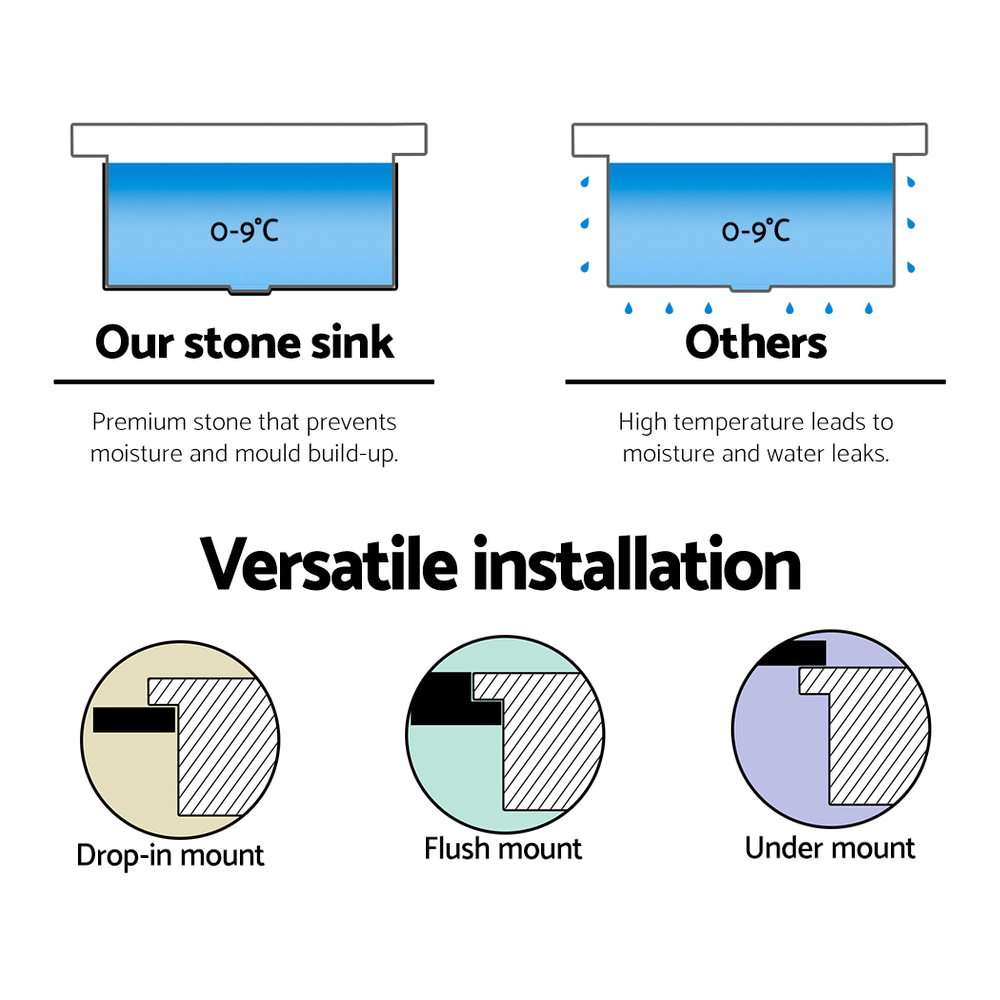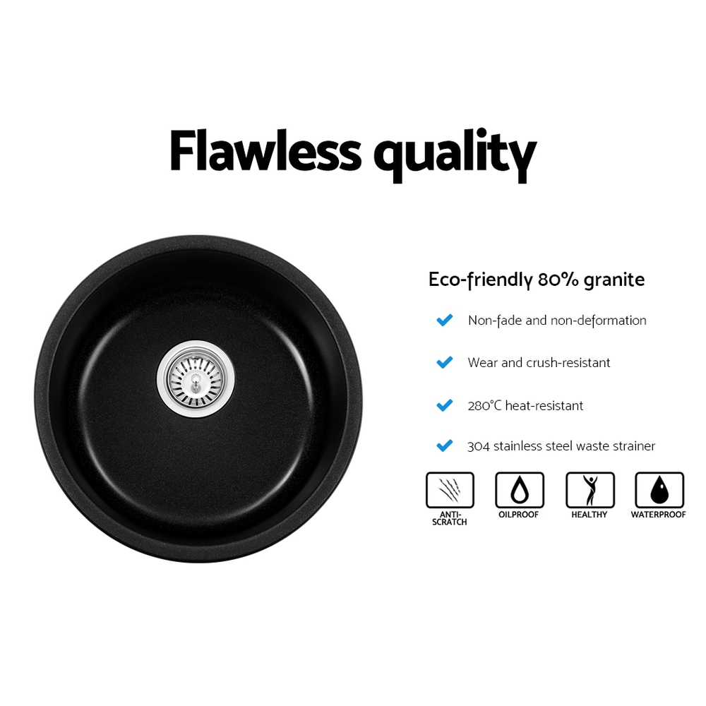 Your beautiful home certainly deserves the best of quality fittings and appliances. More so for your kitchen where meals should be prepared with safe, hygienic and food-grade equipment. That is why the Cefito Black Stone Sink is perfectly suited for your fine kitchen. Made of premium quality white granite stone composite (80% granite), our 9mm thick round stone sink is designed to not only look fabulous but also extremely durable and longlasting. Every bit of the sink is non-toxic, lead-free and highly resistant to heat, scratches, stains and dirt. Oil will not adhere to it and neither does it fade over consistent or heavy-duty use. Easy to clean and maintain, our stone sink lets you fuss over your cooking for a splendid meal rather than the tools. Suitable for top or under mount, our stone sink also features rounded corners for added safety and includes a 304 stainless steel corrosion-resistant waste strainer.