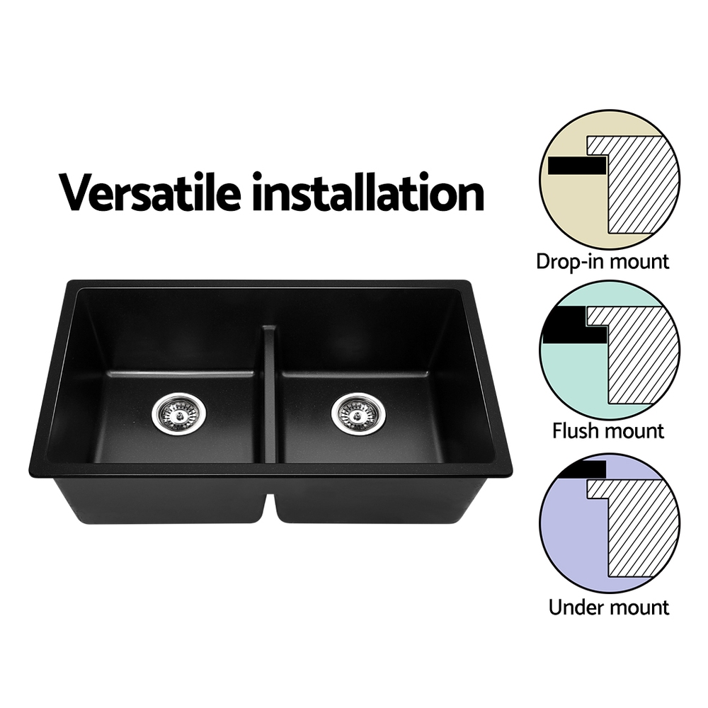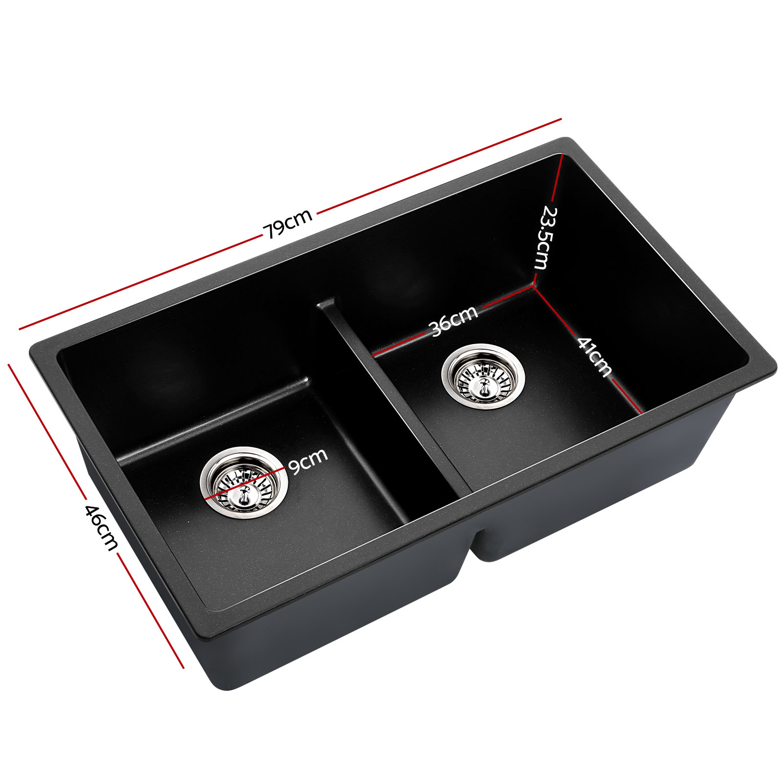 Cefito Stone Granite Kitchen Sink Double Bowl Top Undermount 790x460mm Black