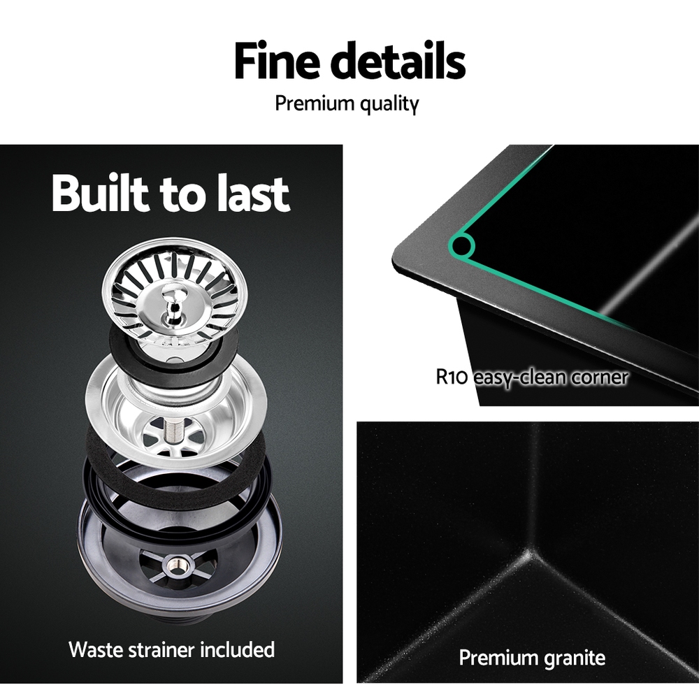 Your home certainly deserves the best of quality fittings and appliances. More so for your kitchen where meals should be prepared with safe, hygienic and food-grade equipment. That is why our premium Stone Sink is perfectly suited for your fine kitchen. Made of premium quality black granite stone composite (80% granite), our 9mm thick stone sink, finished with a silky textured surface, is designed to not only look fabulous but also extremely durable. Every bit of the sink is non-toxic, lead-free and highly resistant to heat, scratches, stains and dirt. Oil will not adhere to it and neither does it fade over consistent or heavy- duty use. Easy to clean and maintain, our stone sink lets you fuss over your cooking for a splendid meal rather than the tools. Suitable for drop-in, flush or under mount, our stone sink also features R10 rounded corners for added safety and includes a 304 stainless steel corrosion-resistant waste strainer.